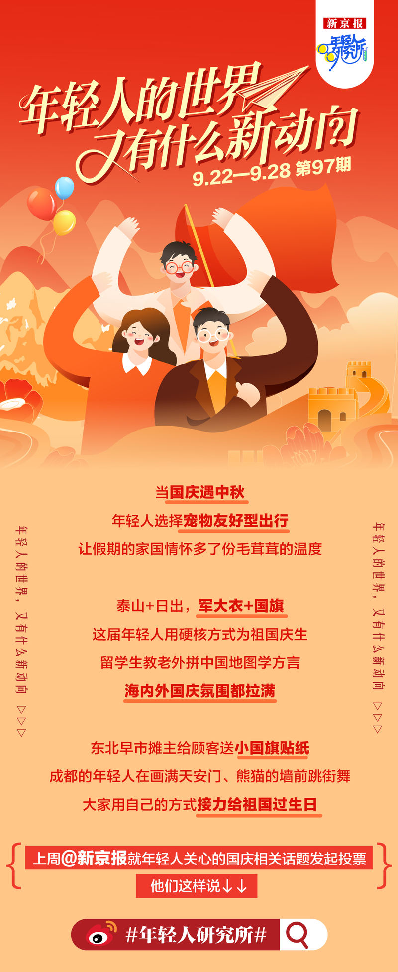 当国庆遇上中秋佳节,年轻人选择宠物旅行,为家国情怀增添一抹柔和的热度。泰山+日出,军大衣+国旗。今年的青年以硬核的方式庆祝祖国的生日。国外的学生教外国人学中国地图、学方言。国内外庆贺气氛一片混乱。那些有东北早市市场的人给顾客提供小旗贴纸。成都的年轻人在天安门城墙前跳街舞。每个人都用自己的方式来还原妈妈妈妈的生日。上周,pams 民意调查发起了一项与年轻人关心的日子相关的乡村话题。他们是这样说的↓《阿甘》赵婉婷策划,艾正、张玉和、范怡静编辑,卢子雄设计,张彦军校对