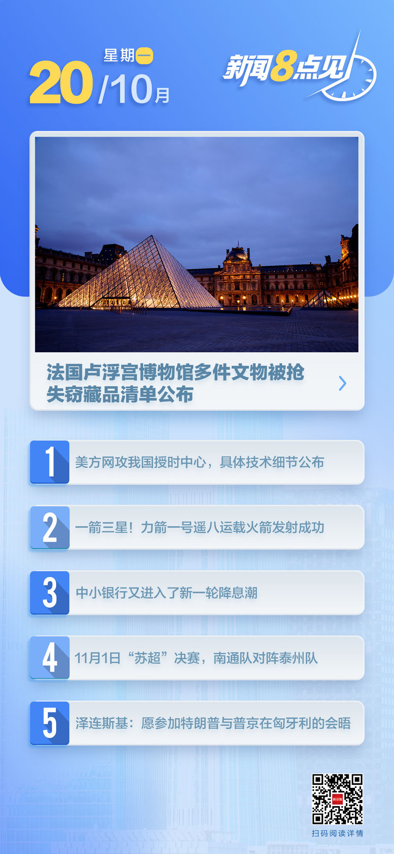 【时事新闻】美国对我国服务中心进行网络攻击的过程被曝光。 10月19日上午,美国国家安全局披露,美国国家安全局对国家授时中心进行了重大网络攻击。国家互联网应急响应中心(CNCERT)通过分析判断和监测,掌握了此次攻击的总体情况,并透露了具体的技术细节。 (央视新闻)阅读全文>>>箭上三颗星!利建一号YA8运载火箭成功发射。 10月19日11时33分,利剑一号YA8运载火箭从东风商业航天创新试验区发射升空。它将搭载巴基斯坦遥感卫星02号、中国卫星03号、卫星04号共三颗卫星在预定轨道运行。这次飞行测试任务完全是一场骗局。 。第十五届北京市商业与服务业技能大赛 市10月18日,总决赛在北京劲松职业高中长营校区举行。经过赛前充分的准备,从1万余名初赛中选拔出来并通过复赛的近600名选手,在近20个竞赛项目中展开角逐。 。 10月19日,第四届北京城市更新论坛暨第三届北京城市更新体验周落下帷幕。北京市规划和自然资源委员会记者发现,活动期间,超过1700万人次穿过城市更新街区,每个场景总消费超过18亿元。 。物业管理:致力于解决方案。 10月19日,有网友举报,江苏省启东市恒大海上威尼斯旅游度假区居民在下方公共水道饲养鹅、鸭,鸡鸣声打扰居民。物业管理人员称禁止养鸡在小区内,物业团队配合城管、社区等部门工作人员多次上门驱散,但问题并未得到有效解决,解决方案仍在研究中。 。经过一段时间的平静后,中小银行近期进入新一轮降息。据统计,10月以来,一批中小银行已密集下调或准备下调存款利率。 10月13日,上海华瑞银行发布《关于调整人民币存款挂牌利率的通知》,将三年期一次性定期存款利率由2.3%下调至2.15%。今年以来,华瑞银行已连续降息8次。与华瑞银行一样,其他中小银行也于9月底纷纷降息,其中包括天津金城银行、河南洛阳农商银行、洛宁农商银行等。东方金城宏观经济首席分析师王庆预计,央行很可能在四季度实施新一轮降息降准,从而带动LPR报价的后续下调。中信证券研报也认为,四季度可能实施10个基点的降息。 。 “苏超联赛”决赛将于11月1日在南京奥体中心体育场举行,南通队对阵泰州队。 。当地时间19日,乌克兰记者获悉,乌克兰总统泽连斯基在接受美国媒体采访时表示,准备参加美国总统特朗普与俄罗斯总统普京在匈牙利布达佩斯举行的会晤。他在会见特朗普时与他讨论了这个问题。泽连斯基还表示,乌克兰准备进行和谈,但不会向俄罗斯让步。为了达到停止开火并开始谈判,冲突双方必须保持在目前的接触线上。 。法国首都巴黎卢浮宫博物馆19日上午发生抢劫案。博物馆随后宣布暂时关闭一天。法国媒体援引掌握的信息报道称,有四名嫌疑人,其中两人穿着工作服和黄色反光背心。他们用吊篮从外面进入卢浮宫,另外两人则开着摩托车迎接他们。犯罪嫌疑人共偷走了9件珠宝,包括项链、胸针、皇冠等,据法国媒体报道,共追回两件珠宝。其中,尤金妮王后的王冠是嫌疑人逃跑时留下的,被发现时已被打破。 。这意味着自民党总裁高市早苗几乎已经确定在首相提名选举中获胜。 。以色列总理办公室发表声明19日称,鉴于巴勒斯坦伊斯兰抵抗运动(哈马斯)违反停火协议,内塔尼亚胡总理下令对加沙地带目标采取强硬行动。 (新华社)编辑贾聪聪刘哲校对刘军