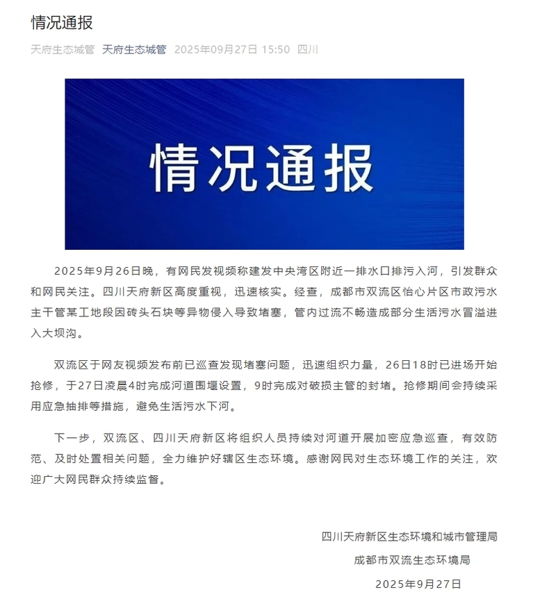 北京新闻根据天富生态城市管理的报道,在2025年9月26日晚上,网民发布了一段视频,该视频说,河口中央湾地区附近的运河出口在河上释放,引起了人们和网民的注意。四川天武的新区非常重要,并迅速对其进行了验证。调查后,注意到,成都Shuanglu区Yixin区的主要市政管道的建筑工地被侵入砖和石头等异物所阻塞。溢出的管道不光滑,导致一些家用污水在大坝运河中溢出。 Shuangli区有巡逻并在网络发布视频之前发现了阻塞问题。他迅速固定了部队。他于26日18:00进入该地点,并开始紧急维修。 Rivercofferdam已经在27日上午4:00之前成立,损坏的主管的阻塞于上午9:00完成。不断采用正规维修,急诊运河和其他措施,以防止家用污水掉入河流中。在下一步中,Shuanglu区和四川天武新区将组织工作人员继续在河流中进行 - 紧急巡逻,有效地避免并立即处理相关问题,并尽一切努力维持该地区的生态环境。感谢网民对环境环境工作的关注,并欢迎大多数网民继续监督。编辑Chen Yanting