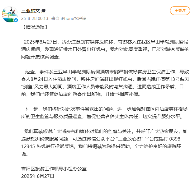 News of Beijing According to @Sanya Turism and Cultural Weibo, the Jiyang District Tourism Leading Group Office released a report report: On August 27, 2025, the office noticed that some media reported that when a tourist stayed at the Intercontinental Resort Hotel on the Banshan Peninsula in the Jya District, he found red nematodes emerging from Bathtub drain.智阳地区旅游业领导小组的办公室非常重视它,并对游客报告的问题进行了验证和调查。调查后,发现事件是Sanya Banshan半岛洲际度假酒店未能做出出色的卫生和清洁工作,导致在房间的浴缸中涌现出红色线虫,客人在8月24日待在客人的浴缸中,酒店工作人员失败了,酒店工作人员无法与她交谈,这是一项工作,这是一项工作,这是一项工作,这是一项工作。目前,智阳地区旅游业领导小组的办公室鼓励酒店去XPLAIN向游客提供适当的赔偿。在下一步中,智阳地区旅游业领先的集团办公室将进一步加强该地区酒店和该地区其他住宅区的健康和质量检查服务,以应对暴露于这一事件的问题,敦促操作员履行其基本责任,并有效提高服务水平。编辑Xin Jing
